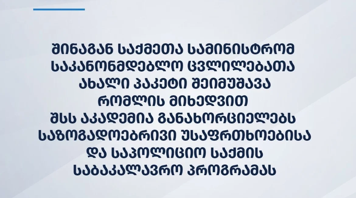 - საქართველოს შინაგან საქმეთა სამინისტრომ საკანონმდებლო ცვლილებათა პაკეტი შეიმუშავა, რომლის მიხედვით შსს აკადემიას უფლება მიენიჭება, პროფესიულ საგანმანათლებლო პროგრამებთან ერთად, განახორციელოს საზოგადოებრივი უსაფრთხოებისა და საპოლიციო საქმის საბაკალავრო პროგრამა. „უმაღლესი განათლების შესახებ“ საქართველოს კანონსა და სხვა თანმდევ საკანონმდებლო აქტებში შესატანი ცვლილებები პარლამენტს განსახილველად უკვე წარედგინა.